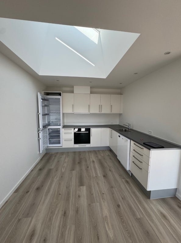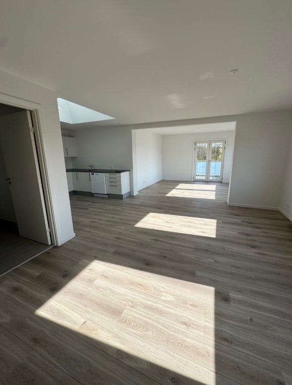 To lyse stuer med åben gennemgang, åben køkken i forlængelse af stuerne, et soveværelse og badeværelse.